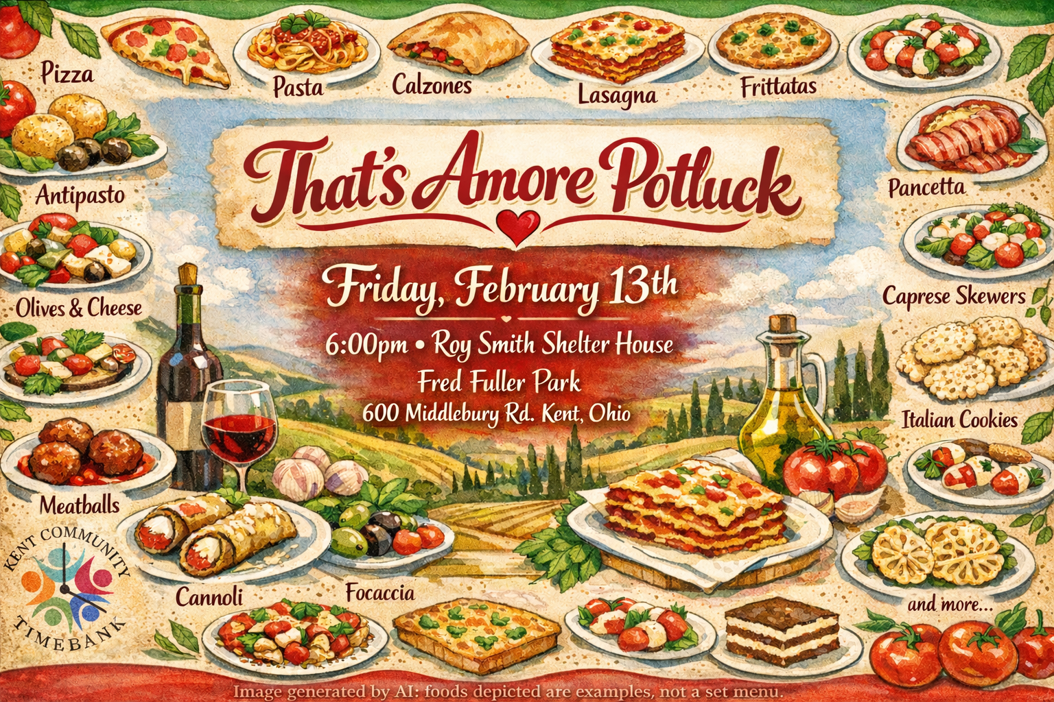 The Kent Community Timebank gathers monthly and hosts a local potluck. The purpose is to celebrate Timebank membership & promote community building through the timebank. The potluck is especially hosted to provide a platform where members of our community, not yet a member of the timebank, can become acquainted with the many benefits of our organization.